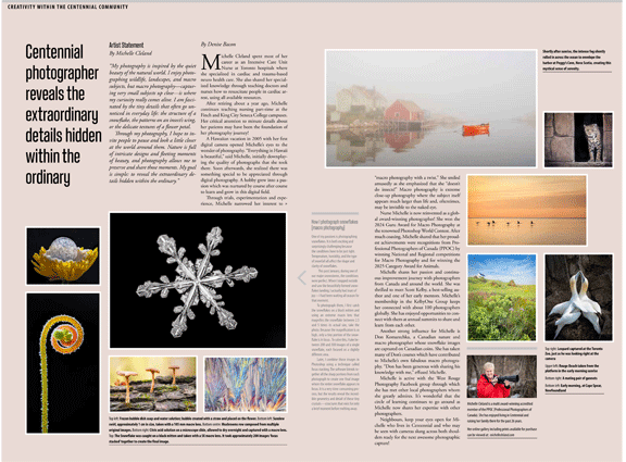 Another strong influence for Michelle is Don Komarechka, a Canadian nature and macro photographer whose snowflake images are captured on Canadian coins. She has taken many of Don’s courses which have contributed to Michelle’s own fabulous macro photography. “Don has been generous with sharing his knowledge with me,” effused Michelle.