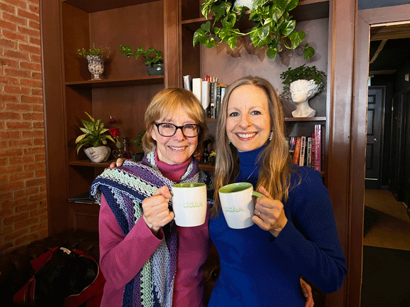 President Kathy Rowe (left) joins guest Marianne Sawchuk for conversation at Creek Coffee