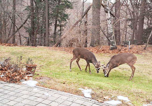 Living on a ravine property, we see many deer ambling through our back garden, but what we saw on Christmas Day was truly awesome! Two bucks were trying to remove each other’s antlers.