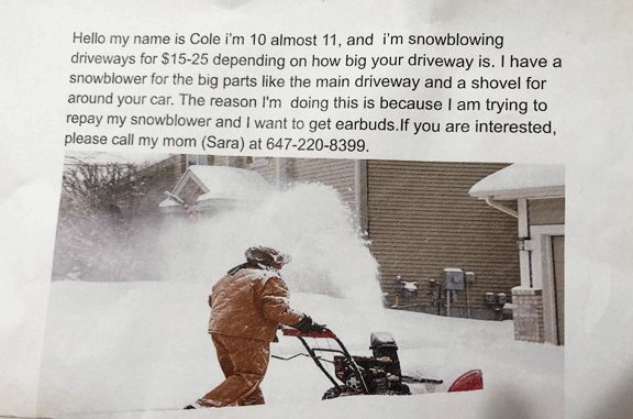 Cole’s marketing message was clear: “..The reason I’m doing this is because I am trying to repay my snowblower and I want to get earbuds.” This personal appeal for business paid off with four regular customers this winter. Now, Cole can do his work with his earbuds in place!